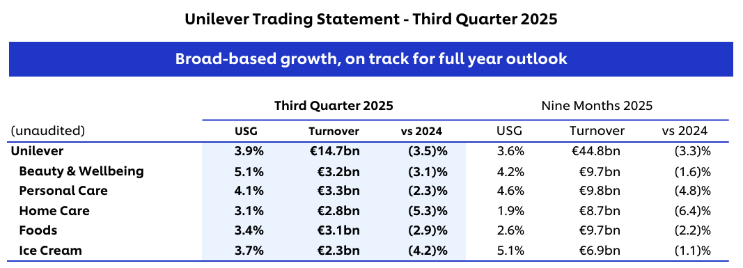 今日(10月23日),联合利华发布了2025年第三季度业绩报告。财报显示,联合利华2025年前9个月营业额为448亿欧元(约合人民币3703亿元),同比下滑3.5%;其中,Q3营收147亿欧元(约合人民币1215亿元),基本销售额增长3.9%。
